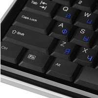 Клавиатура для ПК с интерфейсом USB, оснащенная двойным хабом. Клавиша Fn активирует управление мультимедийными функциями и популярными офисными приложениями (клавиши управления дополнительными функциями совмещены с основными клавишами).