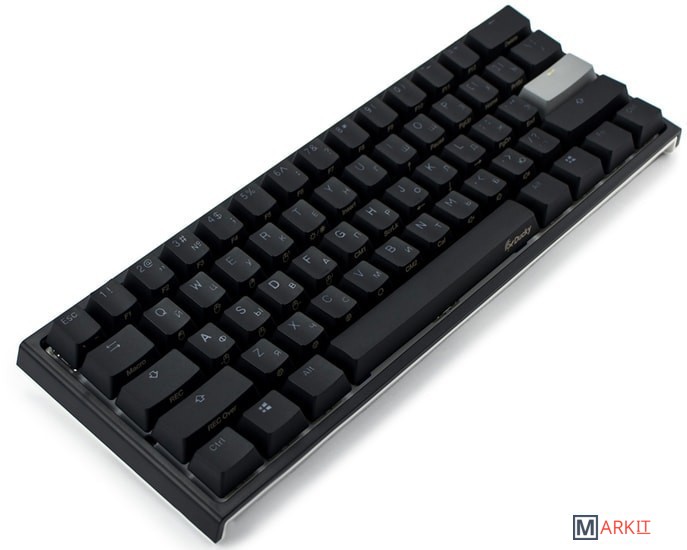 RGB подсветкаПрисутствует множество различных режимов, регулировка цвета осуществляется через палитру или отдельную настройку красного, зеленого, синего цветов. Также можно создать кастомный режим статичной подсветки.ПрограммируемаяDucky Macro 2.0 дает возможность создавать макросы. Можно создать свои мультимедиа, функциональные макросы и многое другое.Регулируемые ножкиДвойные регулируемые ножки предоставляют целых два угла наклона клавиатуры для более комфортной печати, а их прорезиненный низ не даст клавиатуре сдвинуться с местаРусифицированные PBT double-shot клавишиИзготовлены из высокопрочного пластика PBT с применением double-shot технологии, что гарантирует их долговечность и надежность в эксплуатации.DIP-переключателиДают возможность поменять расположение клавиши FN и переключиться между NKRO и 6KRO.Функция Full N-key Rollover по USB (NKRO)Позволяет нажимать одновременно неограниченное количество клавиш. Для печати идеально подойдет как 6KRO, так и NKRO независимо от вашей скорости. Для игр NKRO будет плюсом и неважно, нажимаете ли вы больше 6 кнопок или нет, поскольку, играя в любую игру, вы можете случайно нажать пару лишних клавиш и из-за этого клавиатура имеет шанс не среагировать на нажатие, которые вы хотели совершить изначально. Также присутствует возможность переключения на 6KRO. Информация о совместимости с Mac OS: функции клавиш Launchpad, Mission Control и регулировки яркости экрана отсутствуют. Управление музыкой недоступно по умолчанию (за исключением регулировки громкости), однако вы можете назначить действия управления музыкой на любые доступные для этого клавиши (например, FN + Z, X, C, V, B), следуя данной инструкции. Поменять местами клавиши-модификаторы можно в системных настройках Mac OS.