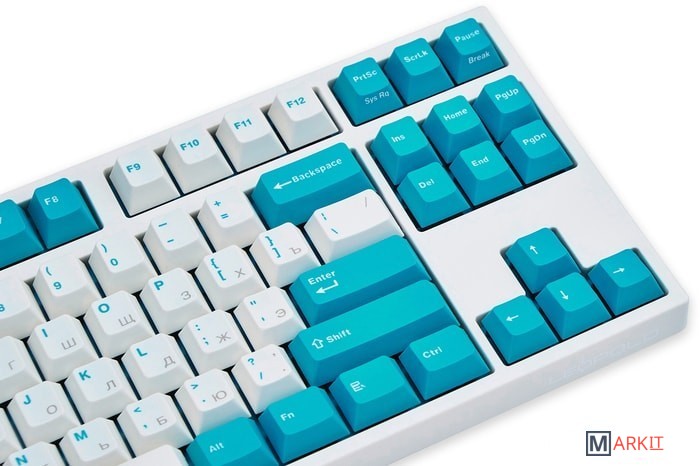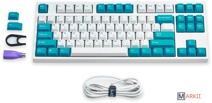 Тип: кликающийСила нажатия: 60 грамм (несмотря на вес, средние)Длина пути: 4 мм (2.2 мм до срабатывания)Данная модель выполнена в белом цвете с мятно-голубыми клавишами-модификаторами — расцветка получилась очень свежей и приятной. Клавиатура собрана добротно и монолитно, а сочетание высококачественных double-shot PBT клавиш с переключателями Cherry MX и звукопоглощающей подложки позволяет сделать печать на клавиатуре максимально тихой (насколько это возможно для механики). Mini-USB порт спрятан в центре под корпусом, а на самой клавиатуре имеются центральная и две боковые канавки под кабель.Клавиатура поддерживает сочетание клавиш для регулировки громкости и управления музыкой, также имеется возможность переключения между 6KRO и NKRO.DIP-переключатели на задней панелиДают возможность поменять местами функции кнопок Ctrl и Caps Lock, Windows и Alt, Windows и Fn или отключить Windows.Звукопоглощающая подложкаПоглощает звуки при нажатии, делая процесс печати более тихим по сравнению с обычными механическими клавиатурами.Низкопрофильные клавиши Step-Sculpture2Данные клавиши заметно ниже и имеют оптимальный угол наклона, из-за чего, по отзывам, печатать приятнее и комфортнее, чем на более высоких клавишах.Клавиатура совместима с Mac OSFN-слой работает (кроме клавиш F6, F8, F9), а поменять местами клавиши-модификаторы можно в системных настройках. Проверено с MAC OS 10.13Функция Full N-key Rollover по USB (NKRO)Позволяет нажимать одновременно неограниченное количество клавиш. Для печати идеально подойдет как 6KRO, так и NKRO, независимо от вашей скорости. Для игр NKRO будет плюсом и неважно, нажимаете ли вы больше 6 кнопок или нет, поскольку, играя в любую игру, вы можете случайно нажать пару лишних клавиш и из-за этого клавиатура имеет шанс не среагировать на нажатие, которое вы хотели совершить изначально. Имеется возможность переключения между NKRO и 6KRO через FN сочетания.