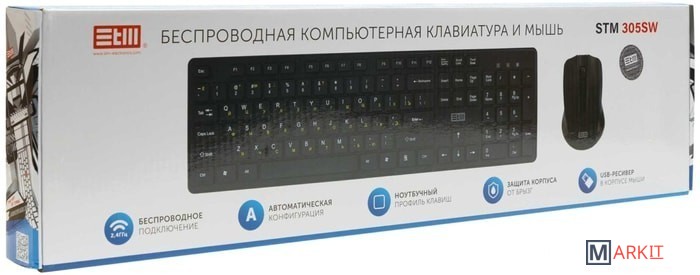 STM 305SW – комплект из беспроводной клавиатуры и мыши. Для работы STM 305SW не требуется установка дополнительных драйверов, клавиатура и мышка готовы к работе сразу после подключения. Клавиатура дополнительно защищена от брызг. Батарейки поставляются в комплекте.