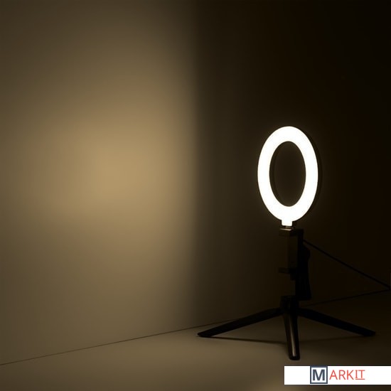 Основные особенности:- диаметр внешнего кольца - 160 мм- диаметр внутреннего кольца - 110 мм- три режима подсветки (теплый свет, холодный свет, нейтральный свет)- регулировка яркости (9 уровней)- индекс цветопередачи 60 CRI- угол рассеивания света130 °- встроенный настольный штатив (трипод)- встроенный держатель для смартфона- пульт управления на кабеле- длина кабеля питания 2 м