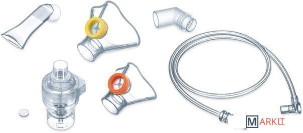 Комплект поставки - Распылитель- Трубка-удлинитель- Мундштук- Маска для взрослых- Маска для детей- Насадка для носа- Запасной фильтр- Кабель Micro-USB- Сетевой адаптер- Сумка для хранения- Сумка- Инструкция по применению