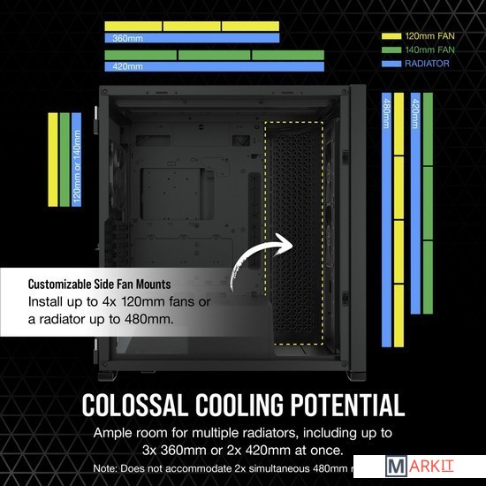 CORSAIR 7000D AIRFLOW — это корпус формата Full-Tower ATX для создания наиболее амбициозных сборок, обладающий невероятным потенциалом охлаждения благодаря оптимизированной для нагнетания воздушного потока стальной передней панели и оснащенный системой скрытой прокладки кабелей и тремя входящими в комплект вентиляторами CORSAIR AirGuide.Вместительное внутреннее пространство, мощный воздушный поток и продуманный дизайн корпуса 7000D AIRFLOW открывают целый мир возможностей для создания авторской неповторимой сборки.Повторитель ШИМ-сигнала вентилятора управляет вентиляторами, входящими в комплект поставки (всего их можно подключить до шести штук). Уменьшайте скорость вращения вентилятора, когда вам необходима бесшумная работа системы, или увеличивайте ее для работы в высокопроизводительном режиме — и все это с помощью одного 4-контактного ШИМ-разъема на материнской плате.Две стальные панели, обдуваемые мощным воздушным потоком, и прочная боковая панель из закаленного стекла толщиной 4 мм обеспечивают превосходное охлаждение и хороший обзор системы.Акцентируйте внимание на своей графической карте с помощью инновационного вертикального крепления для графических карт, которое отличается оптимальным размером для установки самых мощных современных графических карт и обеспечивает достаточное пространство для беспрепятственного воздухообмена.Оснащенный окошком кожух блока питания с возможностью персонализации позволяет увидеть все компоненты системы изнутри. Снимите панель, добавьте виниловую графику, нанесите свой логотип лазером или установите подсветку, чтобы придать вашей системе индивидуальности.Быстро и легко уложите основные кабели в один просторный потайной канал глубиной 25 мм за материнской платой, предусмотренный для всех кабелей, которые легко скрыть за откидной стальной дверцей.
