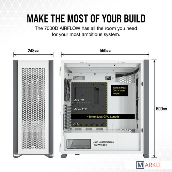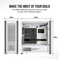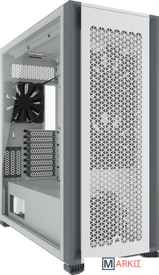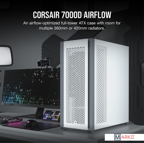 CORSAIR 7000D AIRFLOW — это корпус формата Full-Tower ATX для создания наиболее амбициозных сборок, обладающий невероятным потенциалом охлаждения благодаря оптимизированной для нагнетания воздушного потока стальной передней панели и оснащенный системой скрытой прокладки кабелей и тремя входящими в комплект вентиляторами CORSAIR AirGuide.Вместительное внутреннее пространство, мощный воздушный поток и продуманный дизайн корпуса 7000D AIRFLOW открывают целый мир возможностей для создания авторской неповторимой сборки.Повторитель ШИМ-сигнала вентилятора управляет вентиляторами, входящими в комплект поставки (всего их можно подключить до шести штук). Уменьшайте скорость вращения вентилятора, когда вам необходима бесшумная работа системы, или увеличивайте ее для работы в высокопроизводительном режиме — и все это с помощью одного 4-контактного ШИМ-разъема на материнской плате.Две стальные панели, обдуваемые мощным воздушным потоком, и прочная боковая панель из закаленного стекла толщиной 4 мм обеспечивают превосходное охлаждение и хороший обзор системы.Акцентируйте внимание на своей графической карте с помощью инновационного вертикального крепления для графических карт, которое отличается оптимальным размером для установки самых мощных современных графических карт и обеспечивает достаточное пространство для беспрепятственного воздухообмена.Оснащенный окошком кожух блока питания с возможностью персонализации позволяет увидеть все компоненты системы изнутри. Снимите панель, добавьте виниловую графику, нанесите свой логотип лазером или установите подсветку, чтобы придать вашей системе индивидуальности.Быстро и легко уложите основные кабели в один просторный потайной канал глубиной 25 мм за материнской платой, предусмотренный для всех кабелей, которые легко скрыть за откидной стальной дверцей.