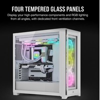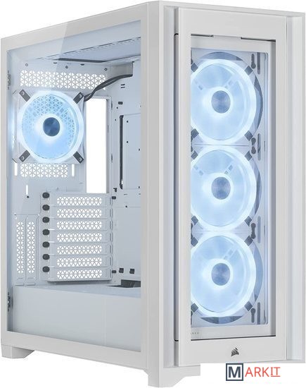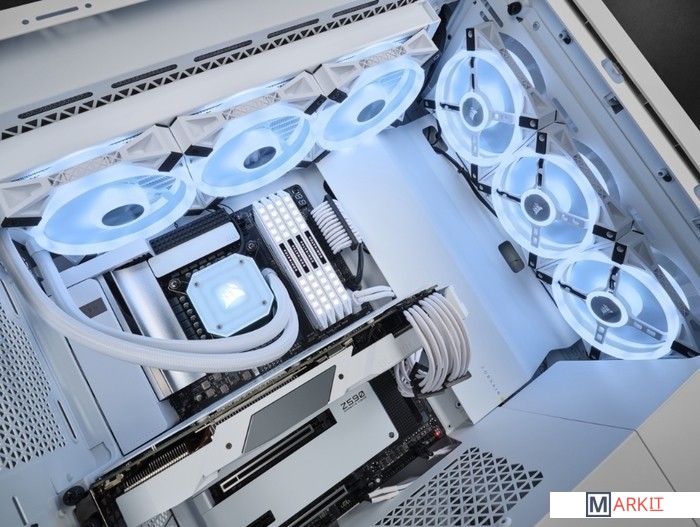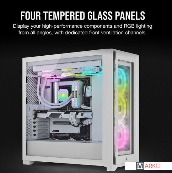 Идеально впишется в белоснежную сборку вашей системы, которая не оставит никого равнодушным.Четыре вентилятора премиум-класса iCUE QL120 RGB со скоростью вращения до 1500 об/мин оснащены 136 индивидуально настраиваемыми RGB-светодиодами, благодаря которым ваша сборка сможет излучать еще больше чарующих цветов и применять ни с чем не сравнимые световые эффекты.Четыре отдельных световых контура на каждом вентиляторе придадут вашей подсветке впечатляющий внешний вид с любого ракурса.Четыре панели из закаленного стекла демонстрируют ваш великолепный ПК во всей красе, а широкие воздушные каналы с пылевым фильтром обеспечивают беспрепятственную подачу мощного воздушного потока.Входящий в комплект поставки модуль iCUE Lighting Node CORE и программное обеспечение CORSAIR iCUE обеспечивают полный контроль и синхронизацию подсветки RGB на шести вентиляторах.Максимальный потенциал охлаждения. В просторном корпусе можно установить десять 120-миллиметровых вентиляторов или четыре 140-миллиметровых вентилятора. Здесь достаточно места и для нескольких радиаторов, в том числе для 360-миллиметрового радиатора спереди и для приточно-вытяжного 360-миллиметрового радиатора сверху.Быстро и легко уложите свои основные кабели в один просторный потайной канал глубиной 25 мм за материнской платой, предусмотренный для всех ваших кабелей, которые легко скрыть за откидной стальной дверцей.