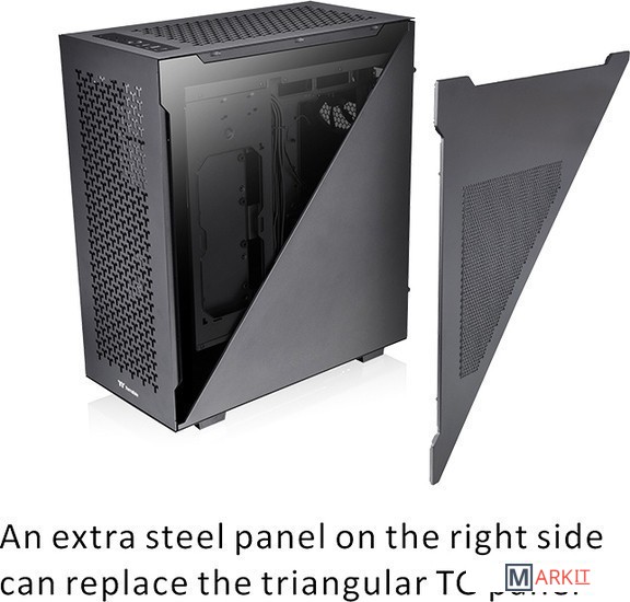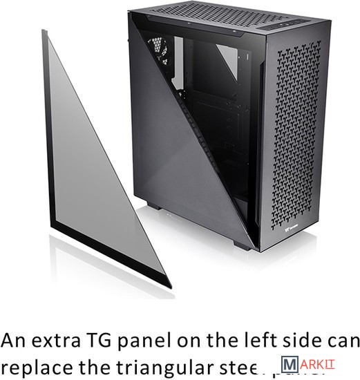 Корпус формата ATX mid-tower с одним 120-мм стандартным вентилятором спереди, одним 120-мм вентилятором сзади, двумя сетчатыми панелями спереди и сверху, двумя прочными 3-мм панелями из закаленного стекла треугольной формы с левой и правой стороны. Помимо этого, в комплект поставки входят две симметричные панели треугольной формы - одна из закаленного стекла, а другая из стали, которые можно использовать вместо штатно установленных для более гибкой конфигурации.Исключительной особенностью корпуса Divider 500 TG Air Snow является то, что составные части боковых панелей можно менять местами. По умолчанию, левая боковая панель состоит из двух симметричных треугольных панелей, одна из которых выполнена из закаленного стекла, а другая из металла. В комплекте с корпусом имеется дополнительное треугольное окно из закаленного стекла, которое можно установить вместо штатной панели из металла, если требуется максимальный обзор начинки компьютера.При желании, штатную половину правой боковой панели из закаленного стекла можно заменить на входящую в комплект металлическую с вентиляционными отверстиями. Выбор остается за пользователем: можно придерживаться штатной компоновки или выбрать вариант боковой панели полностью из металла, где одна из половин будет иметь вентиляционные отверстия, через которые горячий воздух, нагнетаемый вентиляторами с правой стороны от материнской платы, будет легче выходить из корпуса.При желании, видеокарту можно установить лицом к боковой панели при помощи специального кронштейна, который фиксируется на кожухе для блока питания. При таком сценарии исключается возможность провисания видеокарты и нагрузка на слот PCI-E материнской платы, особенно при наличии тяжелого медного водоблока полного покрытия (фулкавера).Кожух для блока питания позволяет улучшить вентиляцию внутри корпуса и спрятать неиспользуемые кабели. Таким образом, интерьер вашего ПК будет выглядеть максимально аккуратно.Запатентованная система поворачиваемых слотов расширения PCI-E дает возможность установки видеокарты в вертикальной плоскости, освобождая больше пространства для установки компонентов системы жидкостного охлаждения. Помимо этого, в вертикальной плоскости видеокарта с большим радиатором смотрится лучше, придавая вашей сборке более лаконичный и завершённый вид.