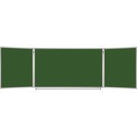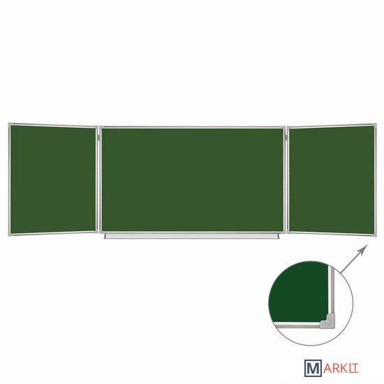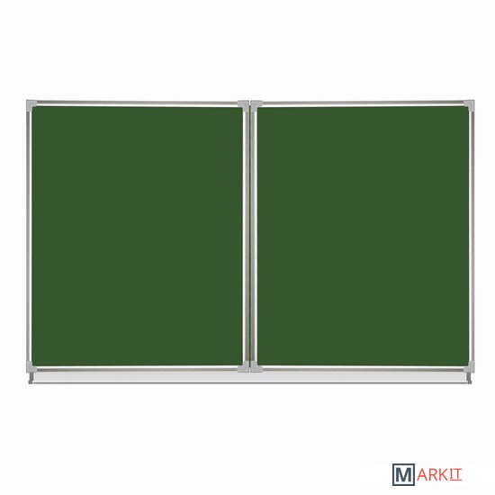 Особенности:— состоит из 3-х элементов: центральная односторонняя секция – 100х150 см, двусторонние боковые секции – 100х75 см каждая;— размеры полки для мела: длина — 135 см, ширина — 4,5 см;— двусторонние боковые секции крепятся к центральной при помощи шарниров;— рабочие поверхности изготовлены из металла с лаковым покрытием;— возможность крепления информации при помощи магнитов;— прочная алюминиевая рамка, укреплённые пластиковые уголки;