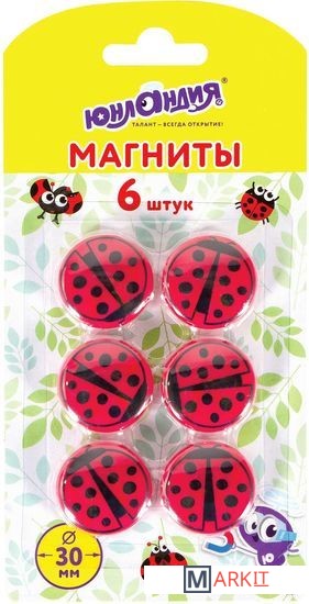 Оригинальные магниты ЮНЛАНДИЯ с рисунком божьей коровки помогут надежно прикрепить листы бумаги к магнитно-маркерной поверхности досок, витрин и флипчартов.Диаметр магнита составляет 30 мм. 6 штук в комплекте. Надежно удерживаются на любой железной или стальной поверхности. Магниты круглой формы выполнены из пластика цветов ассорти. Поставляются в удобной блистерной упаковке с европодвесом.