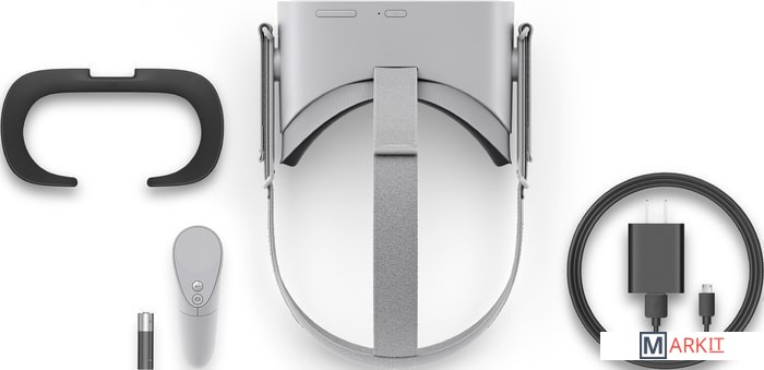 Игровая VR-гарнитура, не требующая подключения к ПК или игровой приставке. Внутри очков установлен 4-ядерный процессор Qualcomm Snapdragon 821. CPU на архитектуре Kryo с частотой до 2.4 ГГц. SoC производится по 14-нм техпроцессу. Объем встроенной памяти составляет 32ГБ.На корпусе расположены две кнопки управления: вкл/выкл и кнопка управления громкостью встроенных динамиков. Присутствует и светодиодный индикатор показывающий статус работы и остаток зарядка аккумулятора. Также предусмотрен разъем для подключения наушников со штекером 3.5 мм и порт microUSB - для зарядки самих очков.Игры доступны в библиотеке Oculus Store, а настройка очков производится при помощи приложения для смартфона. Зарядка очков занимает 3 часа. Кроме того, поддерживается ускоренная зарядка с соответствующим блокам питания.