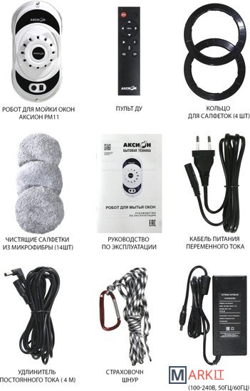 Комплектация робот со страховочным шнуром14 сменных салфетокПульт ДУАдаптер, шнур и удлинительДва сменных кольца для салфеток