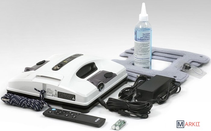Комплектация Робот.Салфетки.Чистящая жидкость.Пульт ДУ + батарейки.Страховочный шнур.Кабель питания.