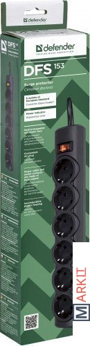 Сетевой фильтр Defender 6 розеток, 3 м, черный (DFS 153) Код: 133003