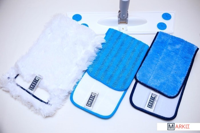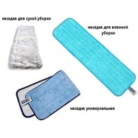 Комплектация швабра, 3 тряпки для сухой уборки(белая и пушистая) и для влажной уборки (плотная голубая) и универсальная насадка (пушистая голубая)