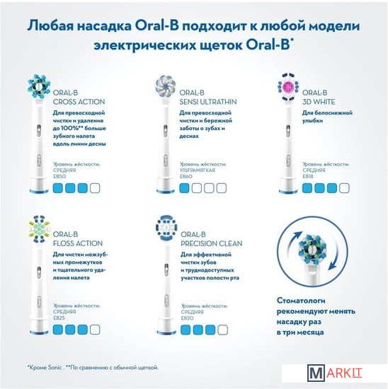 | Совместимые модели | Подходит ко всем электрическим зубным щеткам Oral-B, кроме звуковых электрических зубных щеток Oral-B Sonic/Pulsonic, а также Oral-B iO Series. / Совместима со всеми электрическими щетками Oral-B, кроме Oral-B Soniс. |