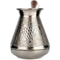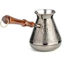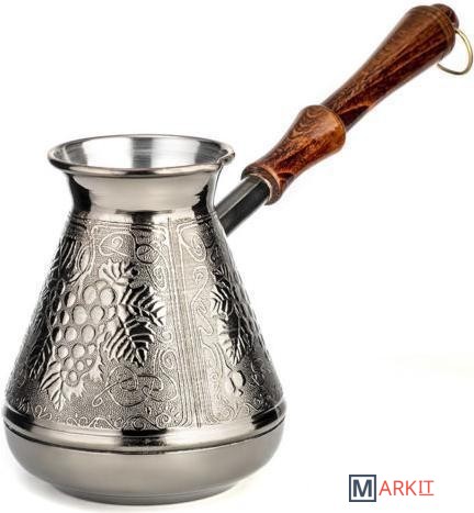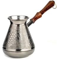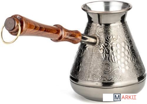 Удобная лакированная ручка из натурального дерева не будет нагреваться при использовании, а металлическое кольцо позволит подвешивать турку и удобного хранить её. Узкое горлышко способствует наилучшему раскрытию вкуса. Подходит для приготовления натурального кофе на газовых и электрических плитах.
