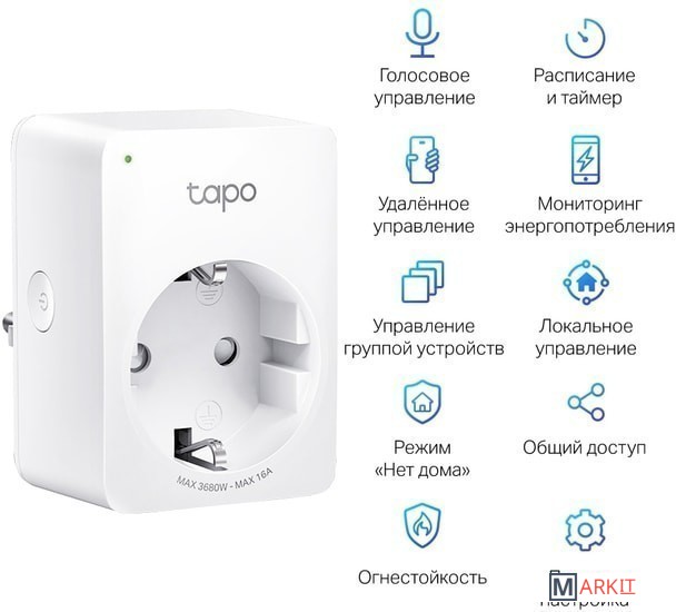 Отслеживайте энергопотребление прямо с телефонаИспользуйте мобильное приложение Tapo, чтобы мгновенно включать или выключать подключённые устройства — где бы вы ни находились. Сделайте свою жизнь проще и безопаснее.Отслеживайте энергопотребление в реальном времени через приложение Tapo. Экономьте с умом, включая бытовую технику во время действия дешёвых тарифов на электроэнергию.Создавайте расписания работы и таймеры на всю неделю. Все подключённые устройства будут автоматически активироваться и отключаться в заданное время, делая жизнь удобнее и энергоэффективнее.Объедините несколько устройств в одну группу, чтобы их можно было вместе включать или выключать одним нажатием.Благодаря небольшому размеру Tapo P110 не загромождает соседние розетки.Нет интернета? Нет электричества? Не переживайте — всё продолжит работать как надо.После восстановления питания розетка Tapo вернётся к одному из состояний.Вы можете делиться правами доступа и управления с членами семьи, экономя время и упрощая использование устройства — особенно для людей в возрасте.Функция «Нет дома» создаёт видимость того, что дома кто-то есть, периодически включая и выключая подключённое устройство (например, лампу).Огнестойкий материал UL94-V0.Защитные шторки уберегут детей.Долгий срок службы и стабильное подключение благодаря нержавеющей стали.Контроль качества CE.Размеры (В × Ш × Д) 51 × 72 × 40 ммМатериал ПоликарбонатМаксимальная нагрузка 3680 Вт, 16 А