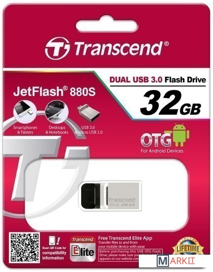 На одном конце JetFlash 880 располагается полноразмерный разъем SuperSpeed USB 3.0, который дает возможность подключить флэш-накопитель к любому оснащенному интерфейсом USB устройству и обеспечивает в 10 раз большую пропускную способность, чем USB 2.0. На другом конце накопителя находится разъем micro USB для подсоединения к мобильным устройствам.Благодаря технологии производства COB (Chip on Board) накопители JetFlash 880 полностью пыле- и влагонепроницаемые.