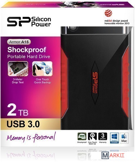 Как и другие представители серии, характеризуется защищенным исполнением: прорезиненный корпус сертифицирован на соответствие американскому военному стандарту MIL-STD-810F, условием которого является падение с высоты 122 см без последствий.Подключение Armor A15 к компьютеру осуществляется посредством проводного интерфейса USB 3.0. Изделие поддерживает функцию быстрого резервного копирования — для ее активации предусмотрена большая кнопка на лицевой стороне корпуса.