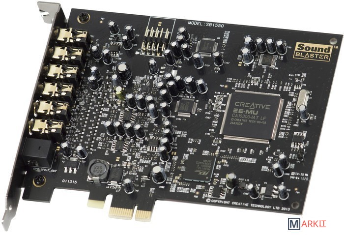 Отличительной особенностью Sound Blaster Audigy Rx от младшей модели (Fx) является поддержка режима 7.1, но данная звуковая карта уникальна еще и наличием двух микрофонных входов (полезно, например, для караоке). Главный элемент на плате модели SB1550 – крупная микросхема Creative E-MU (CA10300-IAT LF), также присутствует отдельный контроллер PCI Express - PEX 8112, в качестве ЦАП выступает Cirrus Logic CS4382.